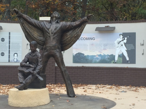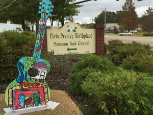 Elvis was born in Tupelo Mississippi on January 8th 1935 in a two room house his father, uncle and grandfather built. He lived there until he was 13 years old, when his family moved to Memphis. Tupelo did a fabulous job of designing a monument to his birthplace and child hood. You can see memorabilia in the museum, visit the house he was born in and even sit in the church where he first heard gospel singing. There is a bigger than life-size statue of Elvis as an adult and in front of that, a statue of him as a child. Tupelo is also home to the hardware store where his mother, Gladys bought him his first guitar for his tenth birthday.